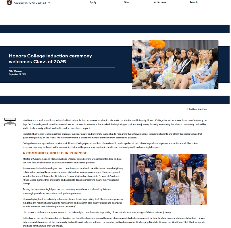 As a Marketing Intern, I support the College’s communications strategy by creating digital content, managing social media platforms and developing campaigns that highlight student achievements and community initiatives. My role also includes writing feature stories, designing graphics and assisting with event promotion — all to strengthen the College’s brand and connect students to opportunities that enrich their Auburn experience.