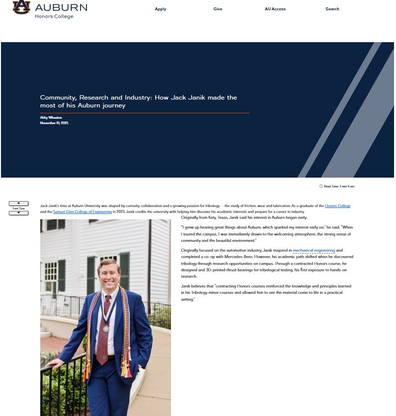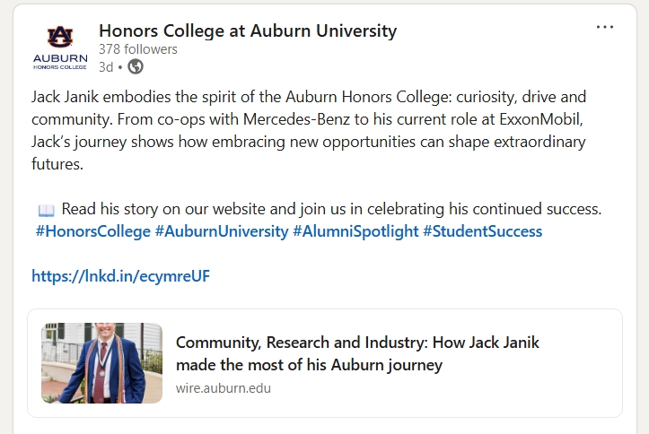 Highlighting my feature on Auburn alumnus Jack Janik, whose path from student to professional made for an inspiring story to tell. I handled the full process—from interviewing and writing to creating the social media rollout across platforms.