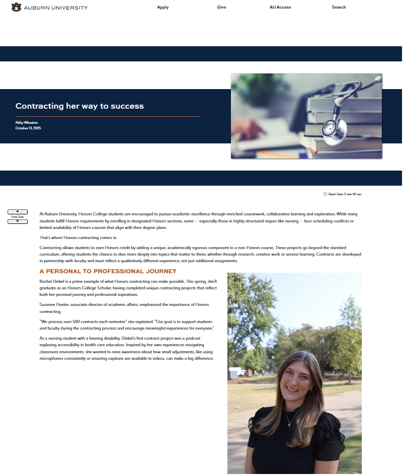 I had the chance to tell the story of Rachel Dinkel, a nursing student who found meaningful opportunities through contracting in the Honors College. I wrote the feature and designed the social media post to share her perspective.