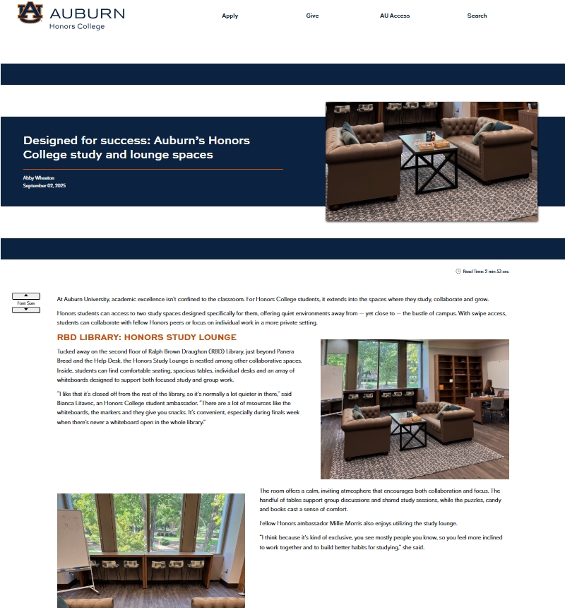 Sharing my feature on the Honors College study spaces, created to help current and incoming students discover the dedicated areas available to them. I interviewed students, wrote the story and captured the accompanying the photos.